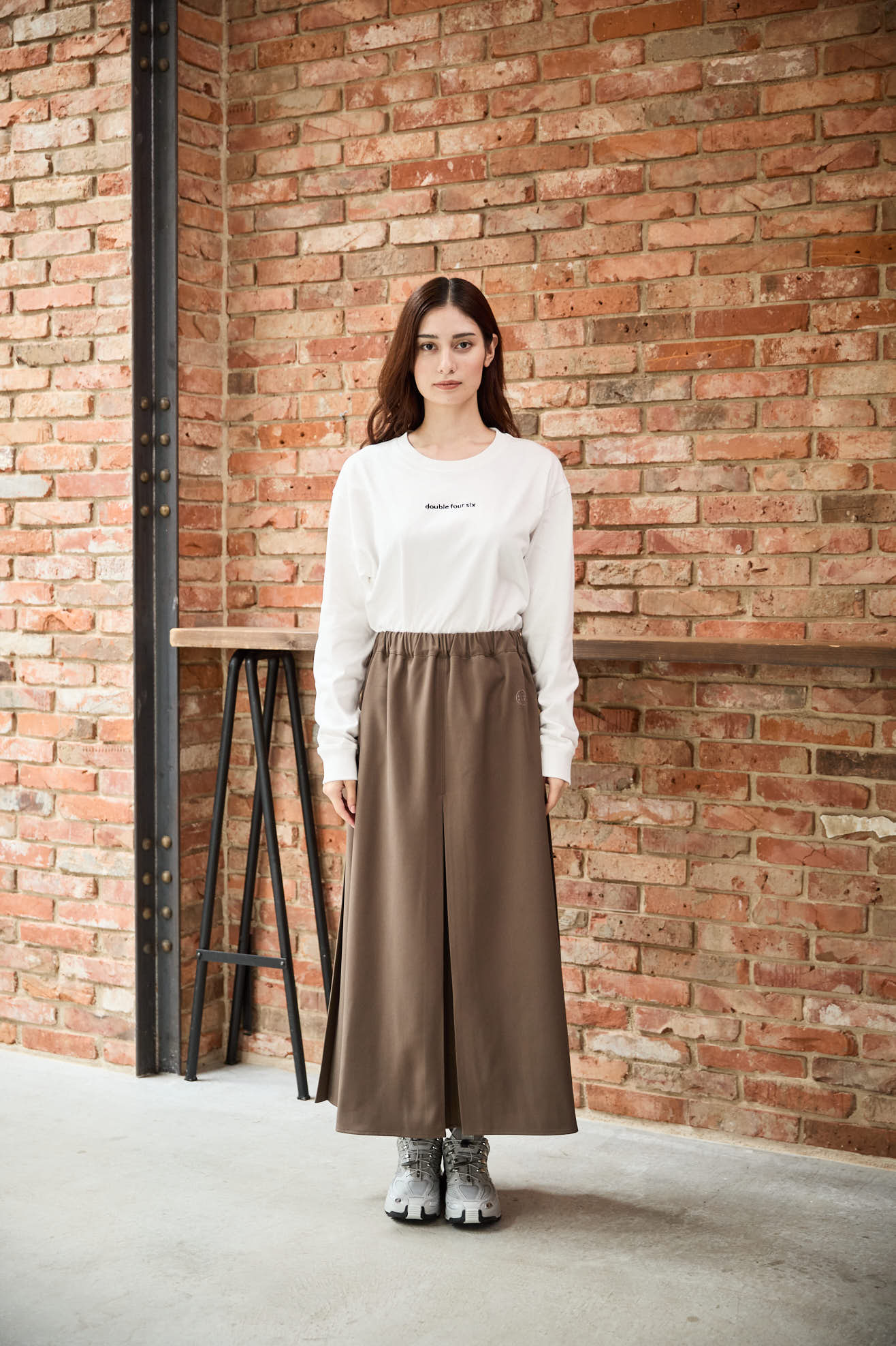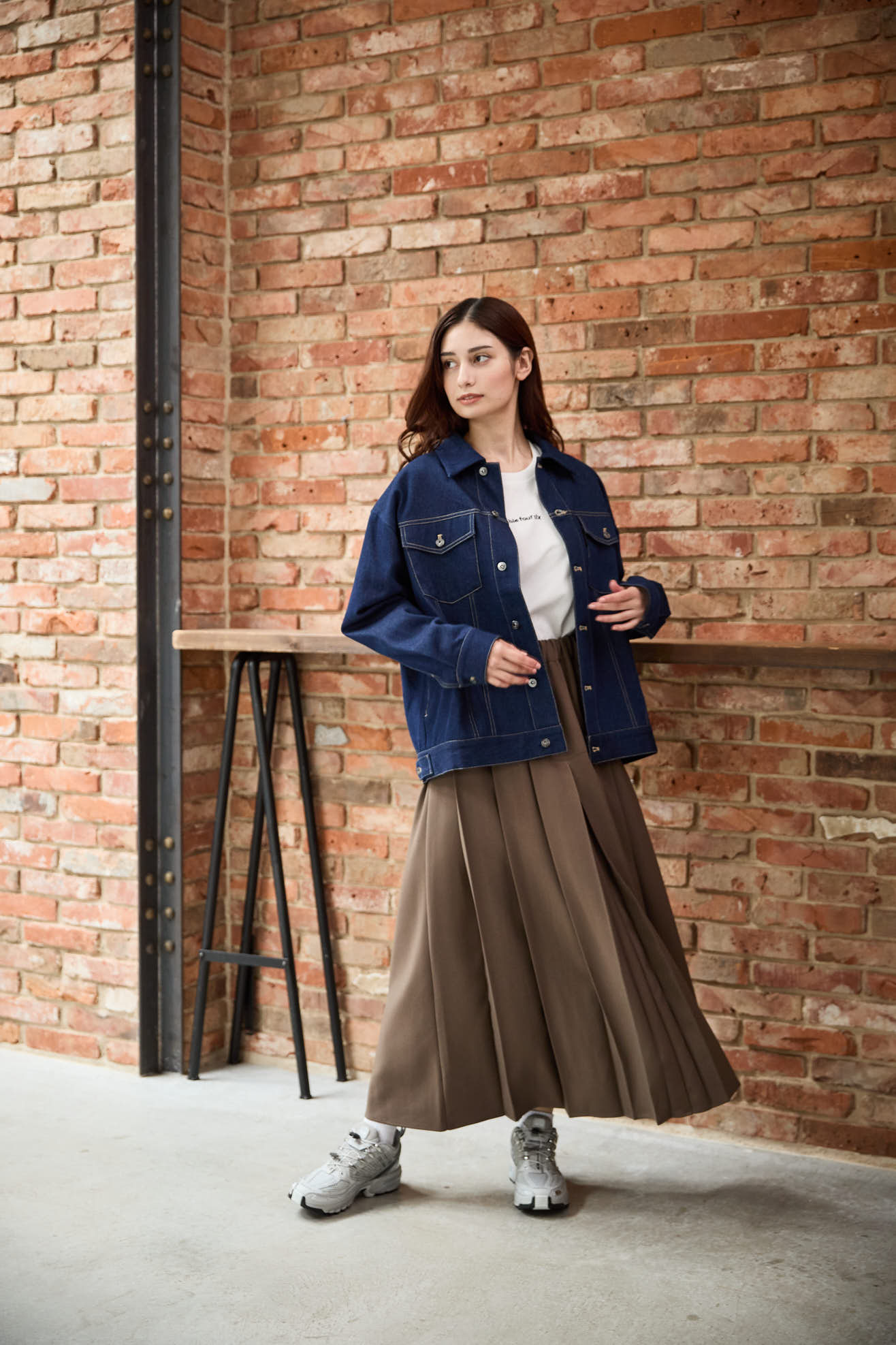 前後で異なるディティールのスカート。印象的なタック&プリーツデザインと垢抜け感のあるミディ丈は、スニーカーからパンプスまで幅広いシューズと好相性。大人カジュアルに着映えるデザインです。
